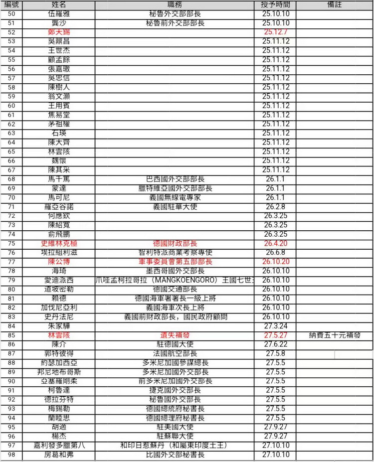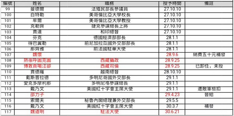 本清册所有黑色字体序号均有明确的档案扫描件支持;红色为暂未有明确档案支持,但根据授予命令时间及顺序缺位对应,虽然前期整理时部分因后续发现明确文件而确认准确,可以认为其余准确性同样较高,但仍然不能排除可能错乱,仅因此此一部分仅供参考。